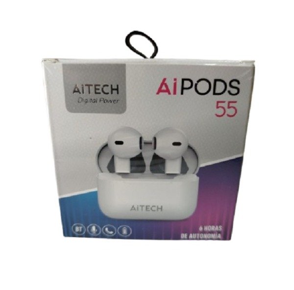 El Aitech iPods 55 combina rendimiento, comodidad y estilo, brindando una experiencia de audio inalámbrica de excelente calidad para música, llamadas o streaming.