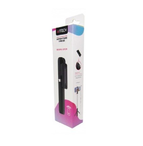 Este selfie stick/trípode posee un diseño simple y hermoso. Cuenta con un estructura innovadora que permite que el grip se abre transformándolo de selfie stick a trípode. Además trae incorporado un control remoto bluetooth.